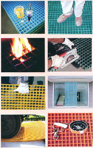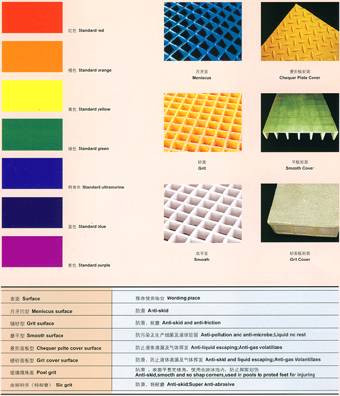 高彈性模量及不同的表面效果使格柵具有防滑性能,輕微彈性減少工作人員的疲勞感,雙平面,月牙面,砂面,菱形封面,