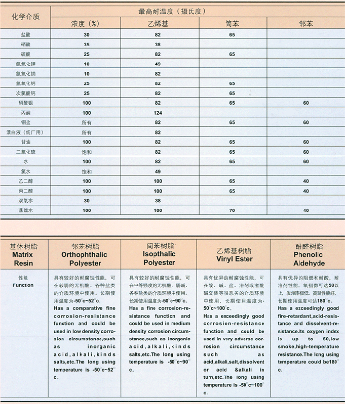 1、 耐腐蝕:具有非常優越的耐酸、耐堿、耐有機溶劑及鹽類等諸多氣、液介質的腐蝕性能,在防腐領域具有無法比擬的優越性。根據實際使用場合要求,可經濟地選擇使用鄰苯型、間苯型、乙烯基型樹脂做基體材料。